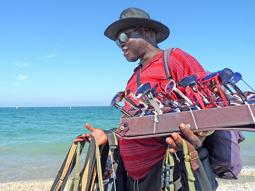 Eikä Italian rannoilla muutenkaan saa ihan rauhassa olla. Vähän väliä aurinkotuolisi vieressä pistäytyy joku, jolla on käsivarret täynnä myytävää: uima-asuja (En muuten oikein tajua näitä bikinikauppiaita. Sillä jos on jo rannalla, niin kai silloin jonkinlainen uima-asukin on jo.), pelejä, leijoja, aurinkolaseja, hattuja. Koruja ja feikkilaukkuja. Afrikkalaisia koriste-esineitä (sillä kukapa ei haluaisi ostaa auringonoton lomassa puolimetristä afrikkalaispatsasta kotiin viemiseksi). Kaupustelijoiden välissä luonasi käydään kysymässä, haluaisitko hierontaa. Tai letityttää hiuksesi. Tai hennatatuoinnin. Onneksi sentään välillä kärryjään hiekassa raahaa myös kookoksen ja vesimelonin viipaleita tai kylmiä juomia kaupittelevat myyjät, sillä vähän aikaa rannalla vietettyään kylmä olut vesipullo tai raikas hedelmäviipale tulee yleensä tarpeeseen.